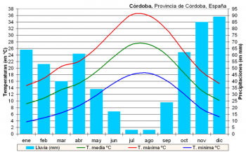 Córdoba tiene un clima mediterráneo continentalizado, con influencias atlánticas. Los inviernos son suaves, aunque con algunas heladas y los veranos muy calurosos, con importantes oscilaciones térmicas diarias y temperaturas máximas que son las más altas de Europa, sobrepasándose todos los años los 40º en varias ocasiones. Aunque las mínimas son más frescas, la temperatura media es superior a los 27º en julio y agosto (las más altas de España y de Europa).